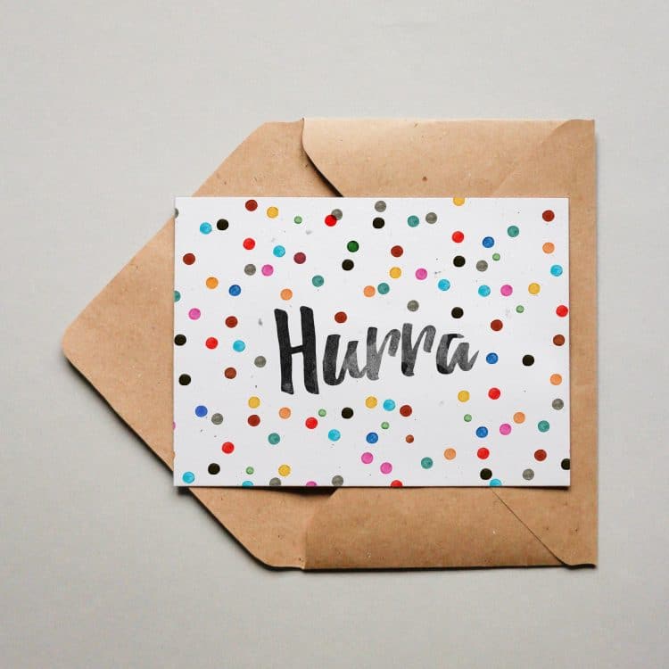 Tolle Jubel-Trubel-Heiterkeits Postkarte „Hurra“ mit Schrift und Pünktchen in Wasserfarbenoptik